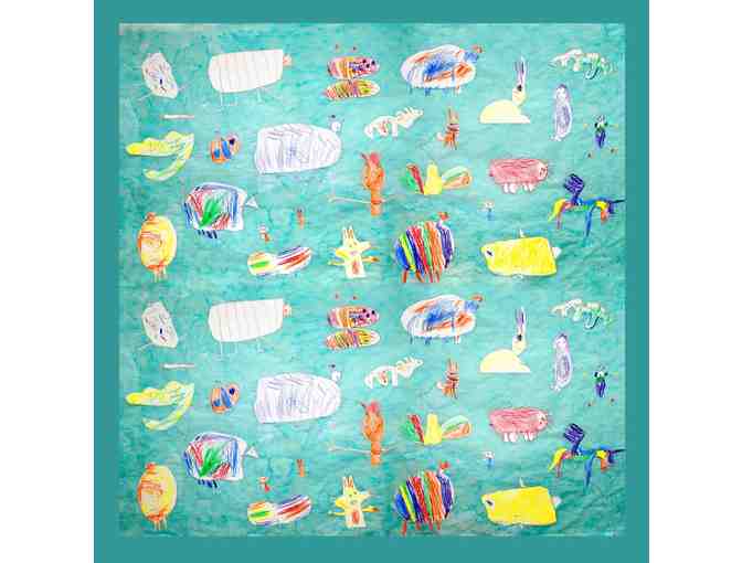 This curtain derived from our Animal classification studies, which are taught during our Letter of the Week Curriculum lessons on Amphibians, Birds, Fish, Insects, Mammals, and Reptiles. After studying all classifications of animals, the children chose which animal they wanted to draw and as a team made a large mural. Their mural was than photographed to be made into a shower curtain.
