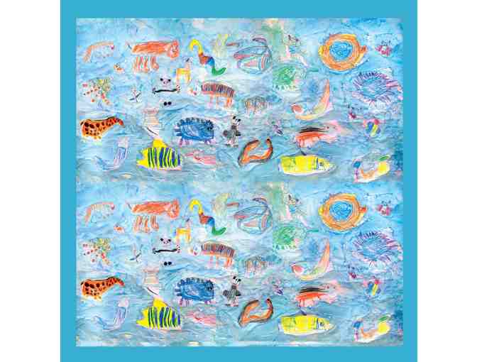 This curtain derived from our Animal classification studies, which are taught during our Letter of the Week Curriculum lessons on Amphibians, Birds, Fish, Insects, Mammals, and Reptiles. After studying all classifications of animals, the children chose which animal they wanted to draw and as a team made a large mural. Their mural was than photographed to be made into a shower curtain.