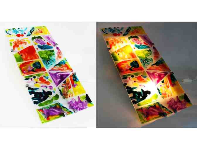 This beautiful glass lamp, painted by the Green Mallard children, was inspired by a lesson on “Rainbows” during R week. The children were taught that rainbows are made by rain and sunlight, and are light and not solid. They also discussed rainbows’ warm and cool colors. The children chose four of their favorite rainbow colors and collaborated to paint the glass panel of this lamp. The light shines through and brings out the beautiful colors of the rainbow!