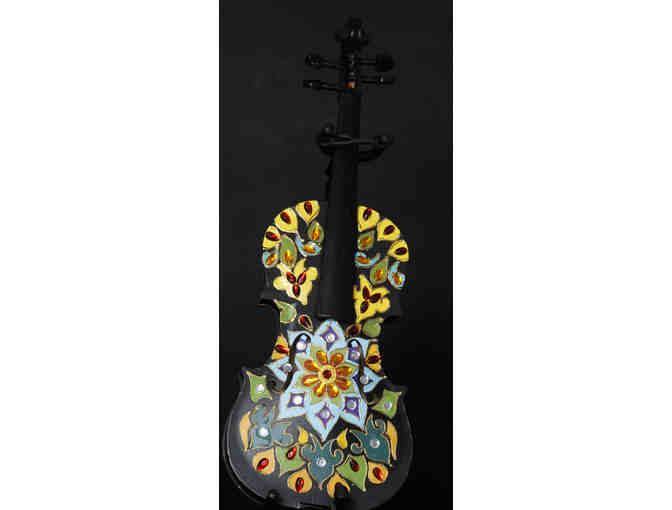 Kala has taught various forms of art including the traditional Tanjore and Mysore art to several hundreds in the Bay Area. Tanjore paintings are notable for their adornment in the form of semi-precious stones, while the symbolism-rich Mysore art is based on various scriptural and mythological texts and often features depictions of gods and goddesses. Kala's violin illustrates two types of traditional Indian folk are: rangoli on the front, warli on the back.