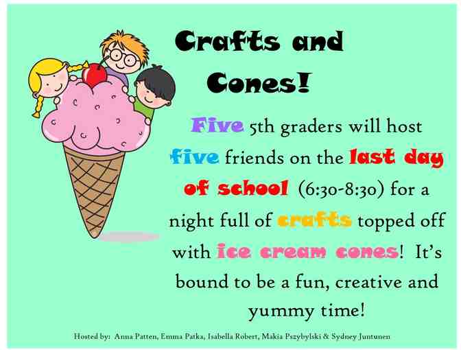 Five 5th graders will host five friends (6:30-8:30pm) for an evening full of crafts topped off with ice cream cones! It's bound to be a fun, creative and yummy time!