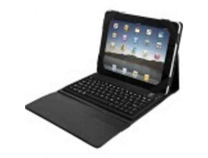 It’s so much easier to have a keyboard! This waterproof silicone keyboard offers quiet, comfortable keystrokes while providing a display stand for easy viewing. It connects wirelessly to iPad 1, iPad 2 and most tablets that feature Bluetooth connectivity. Plus, it’s a 2 in 1 – it’s also a black, faux leather carrying case with multiple elastic straps that will accommodate various sized tablets!