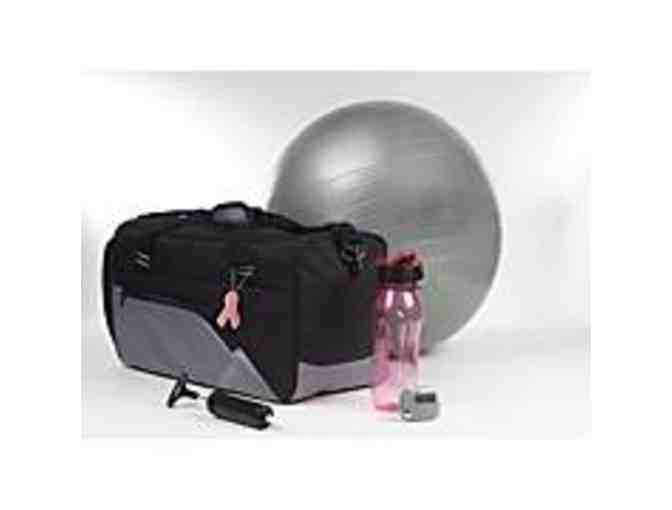 Head to the gym feeling stylish with this black and grey duffel bag and accessories! It contains a pink plastic water bottle to keep you hydrated, and a pedometer to keep you motivated. The duffel bag also contains a 55-centimeter exercise ball with pump to help tone core muscles and for balance work. It has two handy compartments inside and two outside with zippers. Two black mesh handles make it a breeze to carry, or use the included optional over-the-shoulder strap. Display the pink breast-cancer-awareness ribbon that comes with the bag, or not, as you wish.