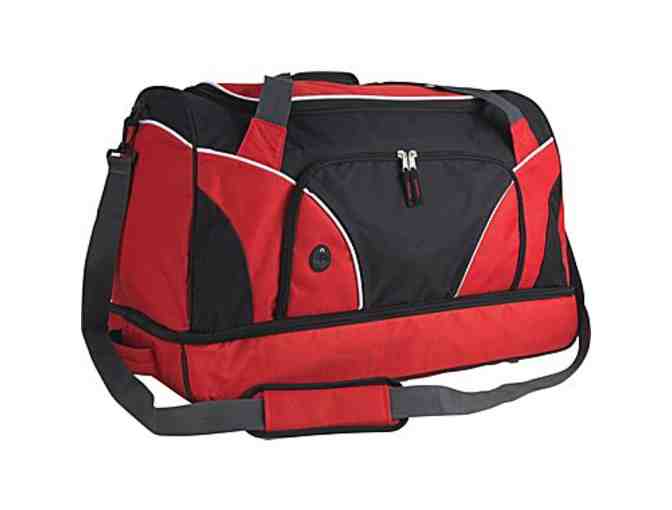 Perfect for going to the gym or weekend getaways, this large, deluxe duffel bag affords you style and convenience. There are separate zippered compartments in both the front and bottom, and its light weight and attractive black and red color make carrying it a pleasure.