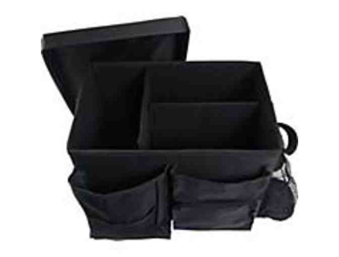 This black, multi-purpose organizer will be handy for families on the go! Measuring 14 inches long, 9 inches wide, and 10 inches high, it includes movable dividers that will keep contents sorted, two drink holders, six outside pockets and a carry strap. The rugged lid can double as a tray.