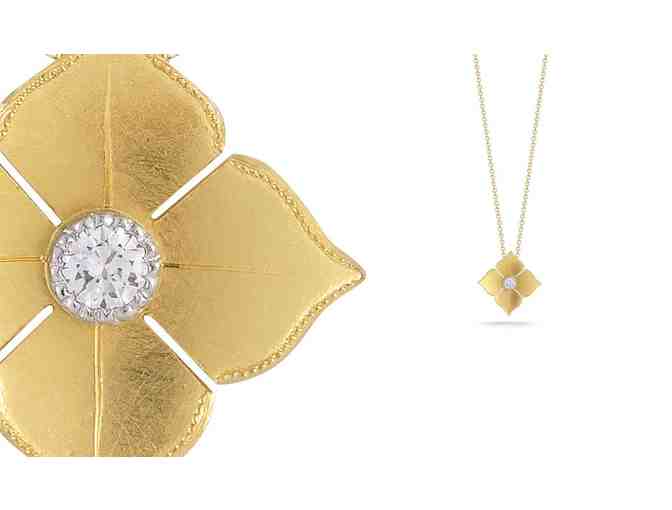 The Small Quadrille Diamond Pendant from the Quadrille Collection features a round brilliant cut diamond weighing 0.05 carat, G/VS1, set in a platinum bezel. The pendant measures 13 mm and is fitted with an 18 inch cable chain. 18 karat bloomed yellow gold and platinum. Handmade exclusively by McTeigue & McClelland.