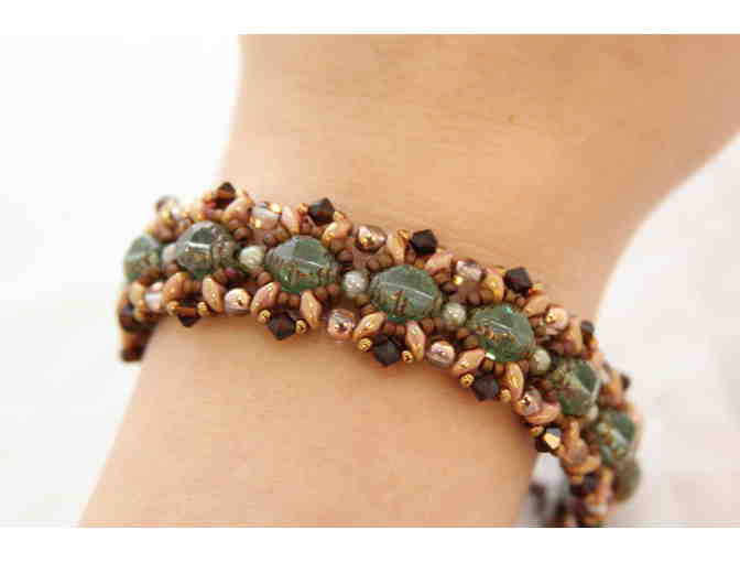 Need just the right bracelet to go with an aqua or pink outfit? This grand baroque 8-½ inch bracelet will do the trick. Lovely bead work sets this bracelet apart. The beads are highlighted by deep and lighter hues of pink set amid larger aqua glass beads. To fasten, just insert the bar end in the circle at the other end and you are set to go.