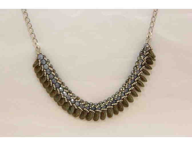As this silver necklace hangs around your neck it will form a "U" shape of blue and green beads that are patterned to resemble a peacock’s feathers. Delicate yet bold, this 18-inch necklace will provide just the right look for so many items in your wardrobe!