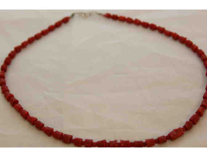 Red, red, red.  Ready to wear the power color?  This beautiful 17-inch red coral bead necklace will make the statement.  Graduated in size, each cylindrical bead is separated from the next by a matching, small ball of coral.  A simple hook and eye closure will keep this piece secure no matter how active you are. A great addition to any jewelry collection!