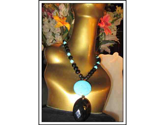 ONE OF A KIND GEMSTONE NECKLACE WITH TURQUOISE AND FACETED ONYX DROP
