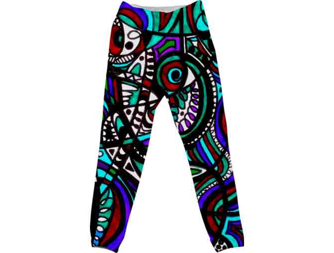 ART WORK will cover the entire pant front  / The backside will mirror the front / Elasticized drawstring waistband and cuffs / Pant has a slight drop in the crotch and is fitted at the legs / The front has side seam pockets and the back features welt pockets / Body is 95% Cotton and 5% Spandex