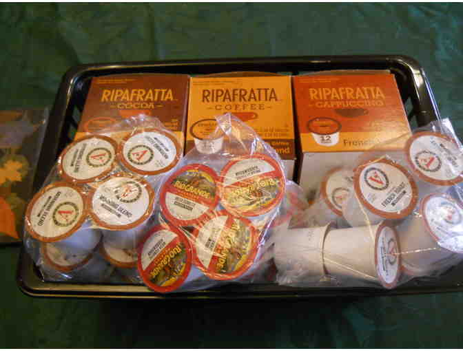 Basket contains individual serving sizes of coffee: one dozen each of French Roast, Mesa Sunrise, Morning Blend, Breakfast Blend, Cocoa, and Cappuccino