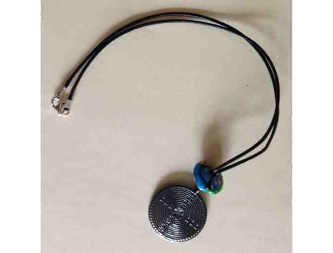 Beautiful pewter Chartres labyrinth pendant, on 18" black leather cord with multi-colored glass bead. Labyrinth is 1.25" diameter.