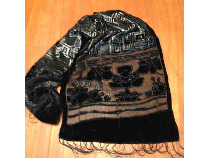 This beautiful scarf has multiple textures and shine in a sophisticated design. 61"x20"