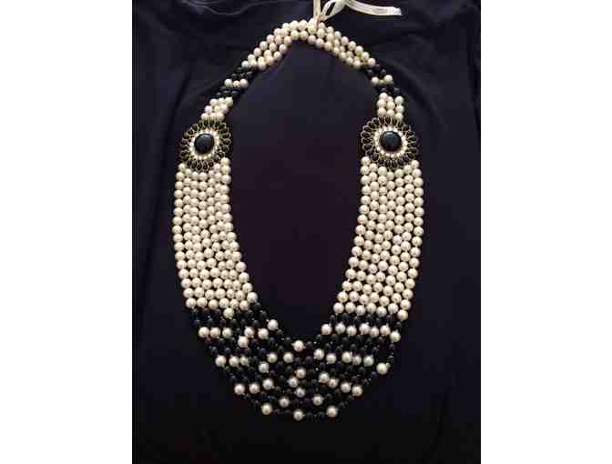 An elegant 7-strand necklace with natural and colored faux pearls and 2 pearl flowers set in gold-tone brass.