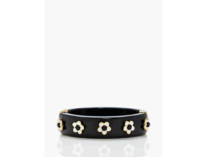 kate spade new york's bangle bracelet features flower motifs filled with cream enamel. Hinge closure. Crafted in gold-tone mixed metal with black resin. Approximate diameter: 2-1/4 inches.