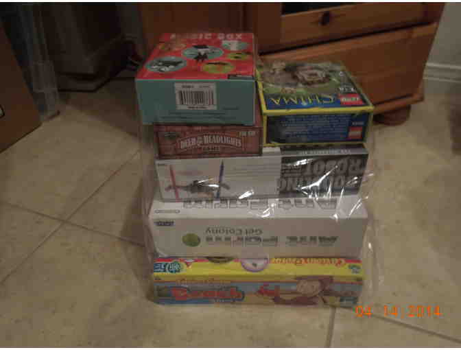 One Lego Chima Legend Beast kit, Deer in headlights game, Magic Box Trick Kit, Doodling Robot Kit, Ant Farm, Curious George Discovery Beach Game