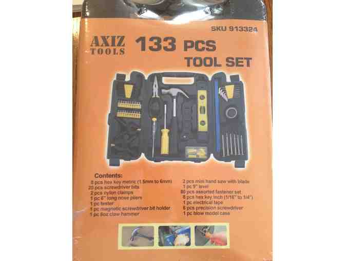 This is a good item for that student away at school or to keep in the office or your car. It is 9" x 12" and contains pliers, hammer, screwdrivers, wrenches and tape - and all the assorted pieces you need to work with them - 133 pieces altogether. Great for all of those little jobs that you need to get done.