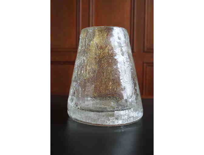 This impressive art piece, with an 8 1/2" base, is one vase your cat will not be able to knock over. Handcrafted and signed by Geoffrey Isle, Tuxedo Park Glass, this 10" tall vase is noteworthy for its crackled glass and the subtle sparkle of gold leaf.