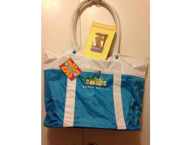Perfect for a day on the beach! This blue and white nylon bag with waterproof lining has outer and inner inner pockets, and comes with its own book, The Secret Life of Bees!