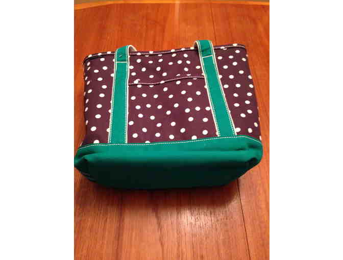 Who can resist? This giant tote by Lands' End is durable and stylish with its white polka dots and green trim on the dark charcoal background.