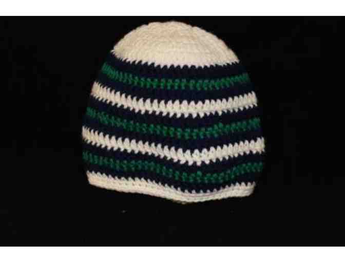 This casual crocheted hat has white, soft navy and kelly green stripes. The hat was handmade by Wendy Sherid, a four-time graduate of The Seeing Eye. The size measures 20 to 22 inches which fits an average female adult.