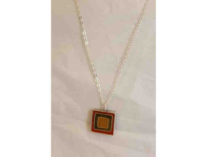 A beautiful square pendant hangs from an 18-inch delicate sterling silver chain. The pendant is concentric squares of orange, green and yellow resin encased in a silver frame. The total square measure ¾ inches. This is the accent piece you need for that special neckline.