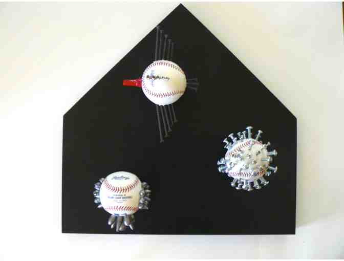 Peggy McCall and Lee Robertson combined their brute forces to transform baseballs into art. Regulation baseballs are adorned with nails, screws and sinkers to make this home plate. The balls stick out from the plate about an inch. (think solar system model in elementary school...)