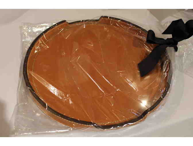 This heirloom-quality bar tray is meticulously crafted from supple saddle leather. Round silhouette with topstitching throughout - this simple piece can be used to display treasures on a vanity, or offer guests refreshments at your next event!