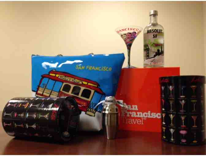 San Francisco tote bag, one bottle of San Francisco Absolut Limited Edition Vodka, 2 "San Francisco-tin Lolita Martini glasses, Ghirardelli chocolate and one martini shaker.