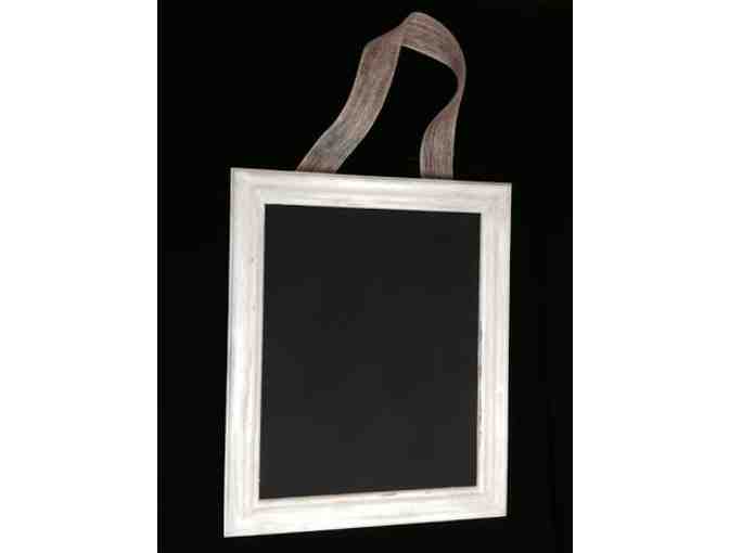 Hang this elegant framed chalkboard in your home for that antique touch! This chalkboard is placed in an upcycled frame that is painted in a lightly distressed antique white. This item will be a beautiful piece in your home!