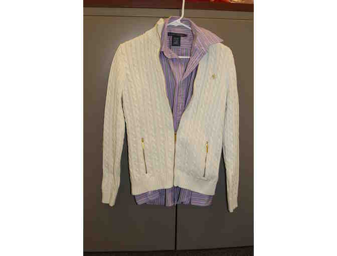To provide warmth for cool evenings, add the beautiful off-white cable-stitch sweater with a gold zipper up the front to a standup ribbed collar. Attention to detail is shown with the matching zippers on the pocket at each side. The Ralph Lauren monogram is embroidered in gold on the left top of the sweater.