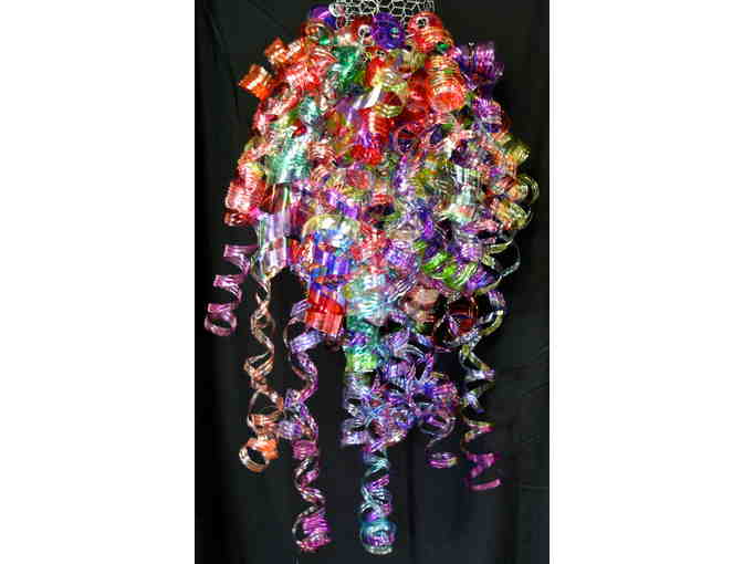 Inspired by the colorful glassworks of Dale Chihuly, First Grade students worked together to create a chandelier-like sculpture. Students colored hundreds of plastic bottles with Chihuly-esque designs using brightly colored Sharpies. Next, the students cut the bottles into spirals, which were attached to a chicken wire cone-shaped frame.