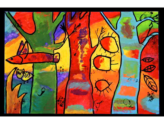 The First Grade Room 4 students selected to emulate Lindy Gaskills A Fantastic Journey for their collaborative canvas. Students began with the background, blending bright colors in different sections of the canvas, and then created texture by using water bottles and textured rags to blot the paint. The tress and animals were added next, followed by additional texture created by stamping on the canvas with wax paper that was covered in black acrylic paint. Lastly, students created the black swirls by dipping string in black paint, creating a swirl formation with the string on the canvas, and pressing it gently with a rag.