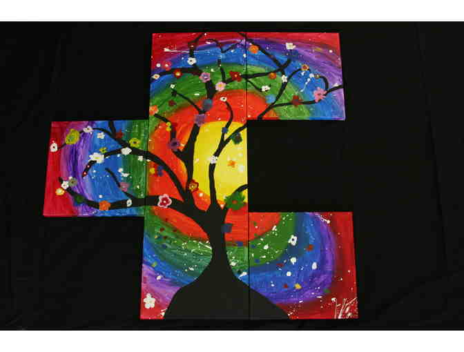 Inspired by Luiza Vizoli's Blooming Tree, second grade students chose to create a bright, colorful painting reflecting nature themes for their collaborative piece. All students participated in each step of the process, from adapting the design of the original work to make it more authentically their own, to creating the blended and splattered background, to painting the tree and adding the multitude of flowers.