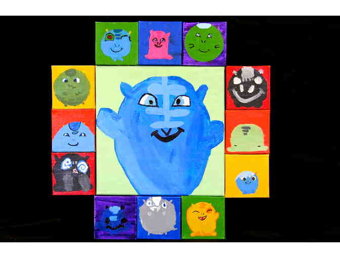 Emulating David Lanham's Hatch Fugus, Fourth grade students worked together to create the large center canvas by first sketching the image of their classroom pet Fugu and then painting it with acrylic paint. Additionally, each student chose an image of their virtual pet Fugu to portray on a mini canvas. After all painting was complete, the class joined all the mini canvases in a border surrounding the larger canvas