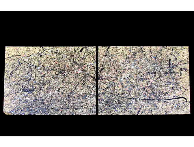 Preschool students in Rooms 1 and 2 worked together on this large-scale dual canvas project, inspired by Pollocks Lavender Mist. Each of the children emulated Pollocks style, using their whole body to create force applying the paint across the entirety of the combined canvases with sticks and stiff brushes in varying sizes. House paint in shades of grey, black, white, tan, and a tinge of blue were used to create this masterpiece.