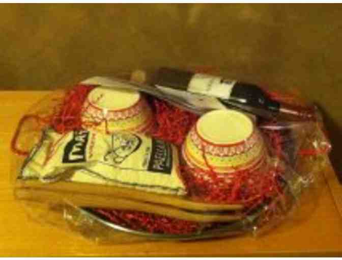 Paella Basket- Pan, Rice, Recipe from Elena Rodriquez de Segovia, $25 gift card to Byerlys, Saffron, Bowls, wooden spoons, red wine, shrimper
