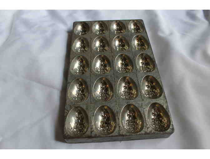 This collection of vintage candy molds are in good considtion overall, and can be used for candy making, or for display. The set includes molds in the following shapes: strawberry, egg, cluster, bunny and "cat's tongue."