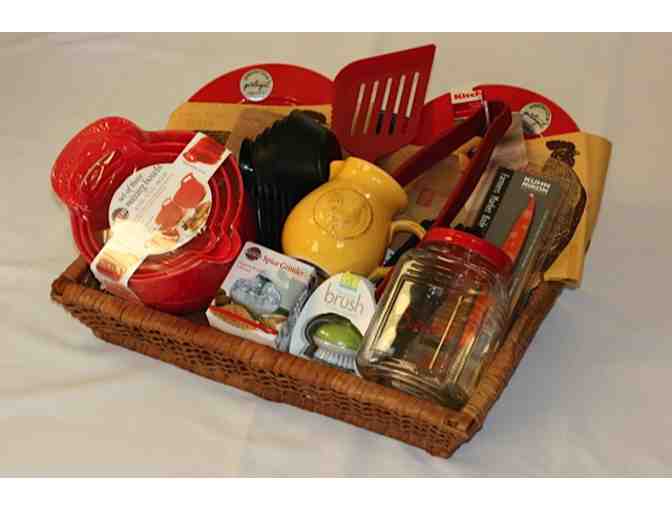 Perfect for the newly married, newly graduated, or newly single person in your life. A wicker serving tray filled $100 worth of kitchen necessities, including: plates, bowls, pitcher, measuring cups and spoons, cutting board, brush, tongs, spatula, cloth napkins, and more!