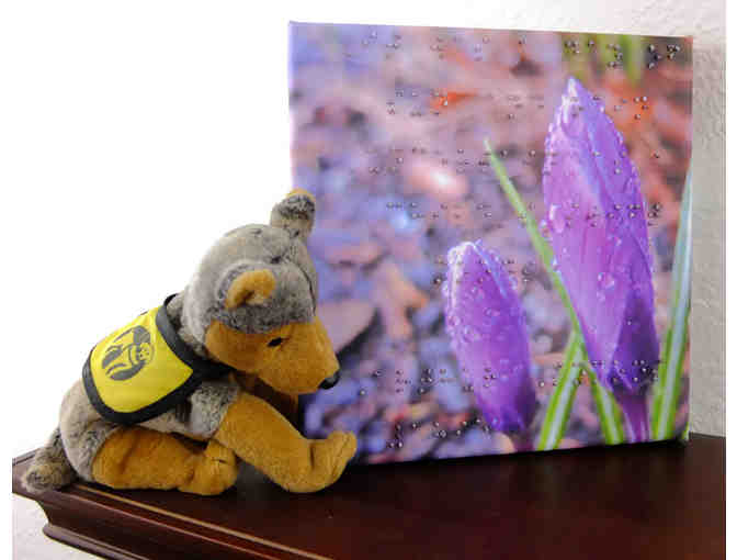 This piece is an 8" x 8" original photograph of a dew-covered purple crocus, printed >on canvas and accented with beaded braille poetry. The lavender-colored seed beads convey an excerpt from a poem by Arthur Symons in uncontracted Braille. The poetry highlights the sun-kissed crocus captured in its gentle and natural setting, and the texture of the beads invokes the gleam of the dew drops clinging to the flowers' petals. The edges of the canvas stretch the colors of the pixels around the sides of the frame. This unique work of art is a conversation-starter and will add a singular and unexpected touch to any room.