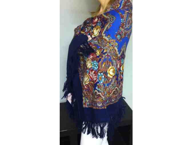 Russian shawl made of 100 % wool provide high quality, softness and drapery of fabric. Skillful artists manage to unite so many different colors and mysterious patterns in one elegant ornamental song.