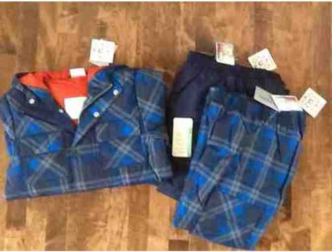 Hanna Andersson Blue Plaid Jacket and 2 Pants (1 Plaid, 1 Solid Navy). One pair of snowboard pants for home and one for school! Size 8 (130 cm).