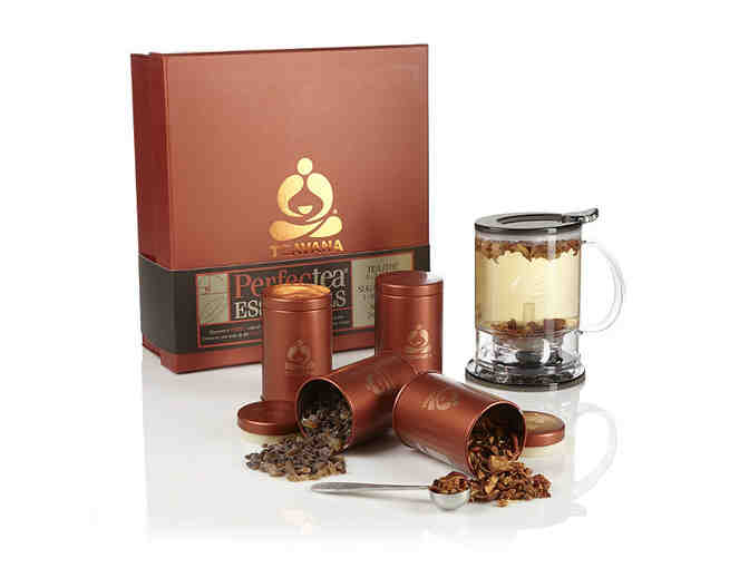One of Teavana's most popular gift items that includes everything needed to create a perfect cup of tea! Includes 16oz PerfecTea Maker along with four of their most popular teas: Matevana tea, Strawberry Lemonade herbal tea, Sakura Allure Green tea, and Rooibos Chai tea. Also includes 16oz of Perfectea Rock Sugar, a PerfecTea Teaspoon and 4 exclusive airtight reusable tea tins. This special gift set makes over 60 cups of tea and is dressed to impress in a copper gift box adorned with their logo. Excellent for the tea lover in your life, whether they are a beginner or connoisseur. Includes 2oz of each tea listed.