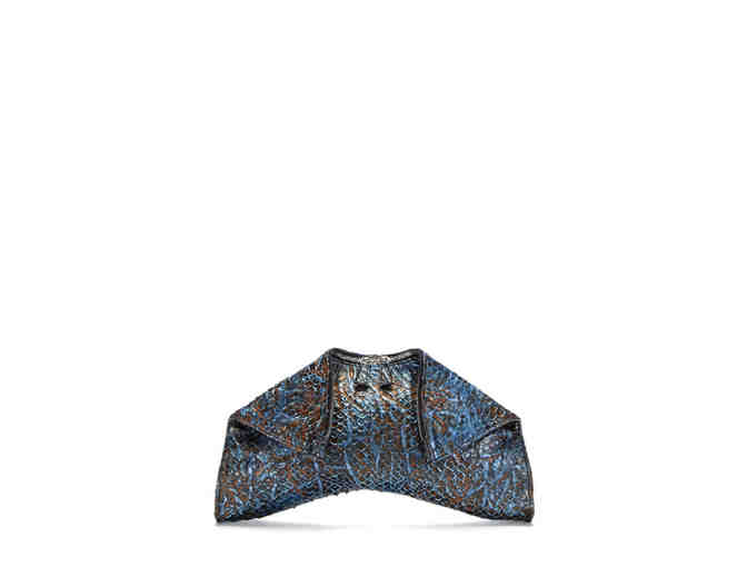 This medium folded clutch in blue and bronze tones was handmade in Italy from python-embossed Italian leather. The tops zip is exposed with double zip pulls, and the corners fold over to hidden magnetic closures. Featuring a tonal fabric lining and internal zip pocket, this bag measures 14.5" W * 10" H * 2" D.
