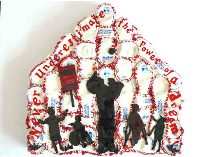 Covers of actual baseballs provide the background for silhouettes of action at the Miracle League, where kids with disabilities play ball.