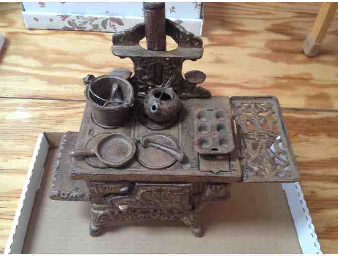 This is a sweet cast iron doll kitchen full of pots, lids, cupcake pan and more.
