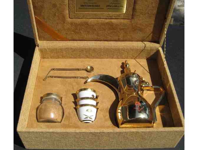 This unique Arabian coffee service box was donated to SIRE by the Mayor of Houston Annise Parker. The set contains an esquisite coffee pot, with four cups and a stirring spoon.