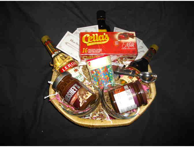 This basket includes a blend of delicious liquors including: Bols- Apricot Brandy, Frangelico and Peppermint Schnapps. To add to your dessert dreams you will find certificates for 6 pints of blue bell ice cream, chocolate toppings, sprinkles, an ice cream scoop, bowls and some chocolate covered cherries to top it off.