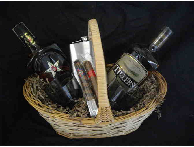 Seagram's 5 Star Rye Whiskey, Tillers Blended Whiskey, two smoke black sipping cups and cigars to top off a true basket for any gentleman. We added in a Texas flask for the nights when the Whiskey is headed out with you.